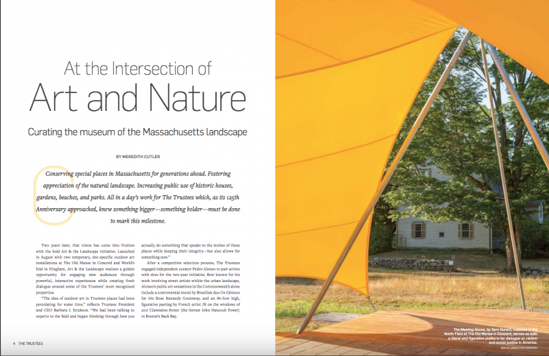 Two years later, that vision has come into fruition with the bold Art & the Landscape initiative. Launched in August with two temporary, site-specific outdoor art installations at The Old Manse in Concord and World’s End in Hingham, Art & the Landscape realizes a golden opportunity for engaging new audiences through powerful, interactive experiences while creating fresh dialogue around some of the Trustees’ most recognized properties.