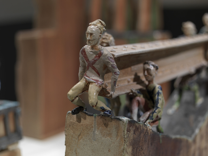 Crawling and perched throughout Zimmerman’s ruinous vignettes, grim-faced clay figurines, seemingly without race, gender or age, labor in rough-hewn detail. Their uniforms are generic — some wear bright sweaters, marked with shiny glaze “X” suspenders, suggesting secondhand and ill-fitted clothing. In Zimmerman’s city, there is no cult of style. Sweatshirts, hats and harlequin patterns echo Goodwill bins.