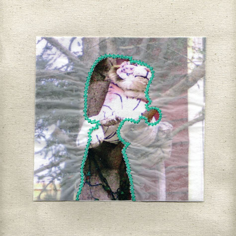 The repeated silhouette of an "anonymous innocent" appears, embroidered in dental floss on waxed paper – commonplace disposables. Stitched, ironed and sealed behind the glass, this minty-fresh, mysterious icon is at once the perpetuator, the seeker and the casualty of the underlying photographic evidence.