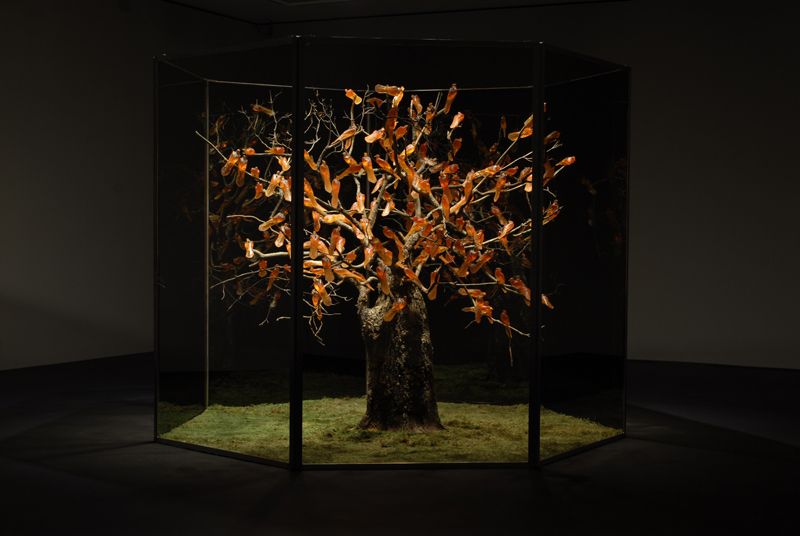 Image: Rachel Berwick, Zugunruhe, 2009, cast copal (amber), wood, two-way architectural mirror, moss, metal, polyester resin.