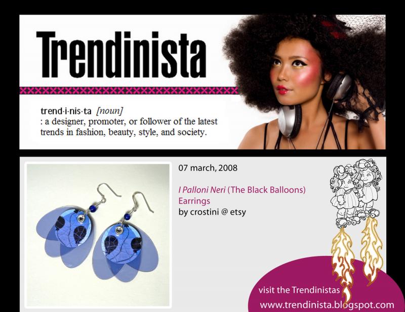 Fashion-forward blogger Jill Sherman at Trend de la Créme (formerly Trendinista) highlighted Crostini Designs' I Palloni Neri (The Black Balloons) signature earrings in a tribute to the color BLUE, following Kelly Osbourne's announcement that she will record a duet of Roy Orbison's 'Blue Bayou' with Brian Evans. Che colori!